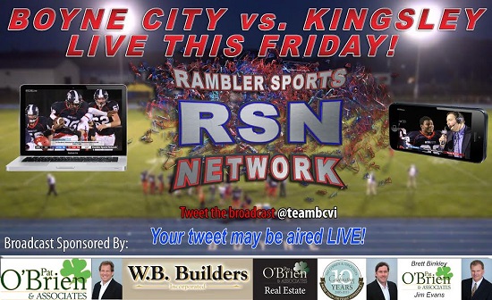 We hope to see everyone in the stands to watch the 3-0 Ramblers take on the 2-1 Kingsley Stags this Friday night at Boyne City's Earl Brotherston Field. For those who can't make it, or for those Rambler fans who want to follow from faraway places, the RSN Broadcast Season begins Friday night. Thanks to our sponsors for helping to make these football broadcasts a reality - Pat O'Brien Real Estate, W. B. Builders, and Jim Evans & Brett Binkley of Pat O'Brien. As always, logon to the Boyne City Public Schools Home Page at www.boyne.k12.mi.us, click the RSN graphic and enter the password. This year, the password will always be the date of the broadcast in MM/DD format, so the Sept. 18 password is 09/18.