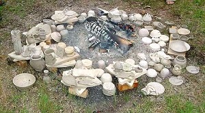Raku pots dry slowly around a wood fire in preparation for a pit firing.
