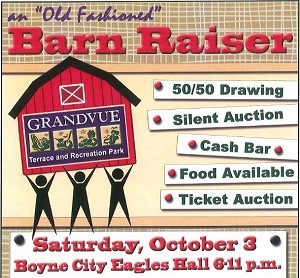 An old-fashioned "Barn Raiser" fund-raising party to benefit the proposed Grandvue Terrace and Recreation Park project will be held at the Boyne City Eagles Hall from 6 to 11 p.m. Saturday, Oct. 3. Music will be provided by Vasco Zucchiatti, Full Circle Band and Tim's DJ Service. The event will also include a 50/50 drawing, silent auction, a ticket auction and a cash bar. Food will be available. The goal of the Grandvue Terrace and Recreation Park project is to have an outdoor area that stimulates the senses, maximizes optimal healthy living, embraces fellowship and gives elders a reason to get up in the morning. It is funded entirely through donations and fundraising efforts. Tickets are $6 in advance or $8 at the door. For more information, call Nancy Lawson, 231-582-9884.