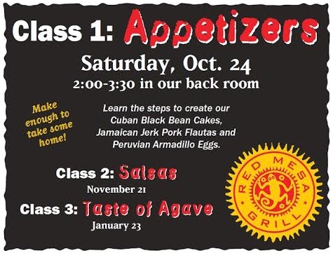 Go behind the scenes and learn to cook some of your favorite Red Mesa dishes as Red Mesa Grill is bringing back a series of three cooking classes. The first class is Appetizers, held from 2 to 3:30 Saturday, Oct. 24 in their back room. Learn to creat the Mesa's Cuban Black Bean Cakes, Jamaican Jerk Pork Flautas and Peruvian Armadillo Eggs. Their chef will demonstrate the step by step process involved in bringing these dishes to life using easy to follow techniques and recipes. Sit back, enjoy a margarita and watch the magic happen for $15 per class. Upcoming classes will feature Salsas on Nov. 21 and Taste of Agave on Jan. 23.To RSVP, call 231-582-0049 or email redmesabc@redmesagrill.com.