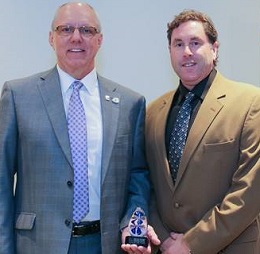 Michigan Realtors President Gene Szpeinski, left, presents award to Jim Evans.