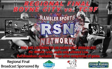 > RSN BROADCAST - For those who can't make it to the game, the Rambler Sports Network will broadcast live audio at 6:55 p.m. Per MHSSA rules, one hour after the game, you can relive all the action, replays and coverage by RSN. The broadcast is available by clicking the game graphic at www.boyne.k12.mi.us. As an audio-only broadcast, there will be NO password. Thanks to sponsors Boyne City Triathlon, Dr. Danielle Swartz/Progressive Dental Care and Great Lakes iPhone Repair for making this broadcast possible.