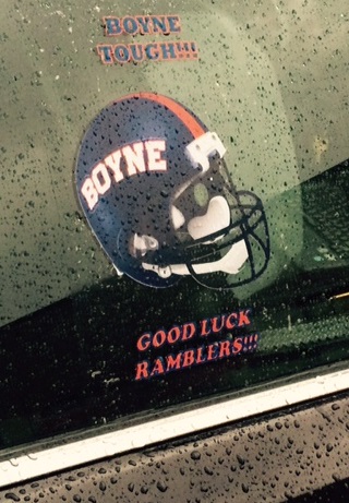 Boyne City Planning Director Scott McPherson designed a poster for display at City Hall that supports the Rambler football team. The Boyne City Police Department took it one step further and with help from Classic Instruments had window decals made up for all of the patrol cars. Chief Gaither said, "Everywhere I went today, people asked how they could get a window decal like that. So I called John again and inquired about making up some more decals. John said Classic Instruments was happy to donate more decals to support the Ramblers." The "Boyne Tough" window decals are now available for a donation of $6 at the High School Athletic office and the Boyne Chamber office. The money raised will go to the Boyne City High School Athletic Department to help support the team.