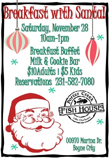 Join Santa at Porter Creek Fish House on Saturday, Nov. 28 from 10 am-1 pm for a Breakfast Buffet and Milk and Cookie Bar. $10 adults, $5 kids. Reservations 231-592-7080. Porter Creek Fish House, 00970 Marina Drive, Boyne City. Dinner with Santa will be at The Bistro at Charlevoix Country Club on Thursday, Dec. 10 from 5-8pm for a Dinner Buffet and Cookie decorating. $15 adults, kids 12 and under free. Reservations 231-547-9796. The Bistro at Charlevoix Country Club, 9600 Clubhouse Drive, Charlevoix.