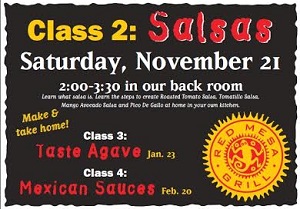 Go behind the scenes and learn to cook some of your favorite Red Mesa dishes as Red Mesa Grill is bringing back a series of three cooking classes. The next class is Salsa, held from 2 to 3:30 p.m. this Saturday, Nov. 21, in their back room. Learn to create the Mesa's Fire Roasted Tomato Salsa, Tomatillo Salsa, Mango Avocado Salsa, and Pico de Gallo. Their chef will demonstrate the step-by-step process involved in bringing these dishes to life using easy to follow techniques and recipes. Sit back, enjoy a margarita and watch the magic happen for $15 per class. Upcoming classes will feature Taste of Agave - Cooking with Tequila on Jan. 23 and Mexican Sauces on Feb. 20. To RSVP, call 231-582-0049 or email redmesabc@redmesagrill.com