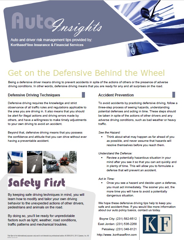 Get on the Defensive Behind the Wheel Being a defensive driver means driving to prevent accidents in spite of the actions of others or the presence of adverse driving conditions. In other words, defensive driving means that you are ready for any and all surprises on the road. Defensive driving requires the knowledge and strict observance of all traffic rules and regulations applicable to the area you are driving in. It also means that you should be alert for illegal actions and driving errors made by others, and have a willingness to make timely adjustments to your own driving to avoid an accident. Click here for tips from KorthaseFlinn Insurance for defensive driving.