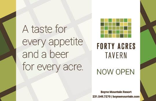 It has a taste for every appetite and a beer for every acre. Introducing Forty Acres Tavern at Boyne Mountain Resort. Sit slopeside this Saturday from 5-9 p.m. for the Grand Opening Celebration of this newly renovated tavern - equal parts watering hole and refueling station. Learn the story behind the name and sample the menu - elevated pub fare with a roster of 40 beers. Register to win a Ski & Stay package that includes dinner at Forty Acres Tavern with the winner chosen at 9 pm. It's forty-acres-worth of fun! Menu, details and the story behind the name. News-Review story.