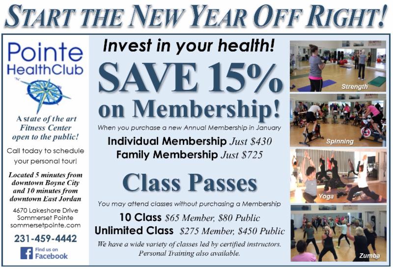 New Year's resolution: Get fit at Pointe Health Club Purchase an Annual Single or Family Membership at Pointe Health in December or January and get 15% off. Your membership gives you 24-hour access to our state-of-the-art facility including strength equipment and free weights, cardio equipment with personal televisions and earbud jacks and Men's and Women's locker rooms with steam shower. Varied classes, massage and personal training are also available. Point Health is located at 4670 Lake Shore Drive; just 5 minutes from Downtown Boyne City and 10 minutes from Downtown East Jordan. Giving yourself or a loved one the gift of good health is a gift that keeps on giving. Call for a personal tour and to purchase your membership at 231-459-4442. Website. |