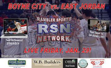 Tonight, Friday, Jan. 29, live from the Wheelhouse, the Rambler Sports Network will be broadcasting the boys and girls basketball games against East Jordan. Tune in and catch all the great action on the court as well as all of the Fun Fan Activity Events put on by the Boyne City Marketing Class, such as the "Mascot Dance Showdown," the "Student Section War," "Match Dash" and more. The broadcast will go live at 5:30 p.m. with the girls contest, and then the boys game immediately following the girls. As always, go to www.boyne.k12.mi.us, click the graphic and enter the password: 1.29. If you can't make it to the game, send a tweet to @TEAMBCVI and be part of the action. RSN is hoping to display a lot of tweets on air live from both Boyne City and East Jordan fans.