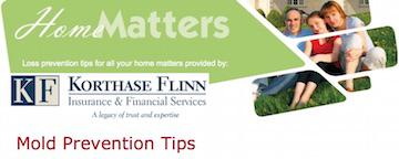 KorthaseFlinn Insurance and Financial Services is providing some mold prevention tips. Most homeowners dread the thought of having to deal with a mold problem, but by practicing some simple prevention tips, you can greatly reduce your mold risks. The key to mold prevention is moisture control. When excessive amounts of moisture accumulate indoors, mold growth occurs if the problem is not corrected quickly and properly. While it is impossible to eliminate all molds and spores from the air, it is possible to control indoor moisture, and therefore curb mold growth in your home. More tips on this info sheet.
