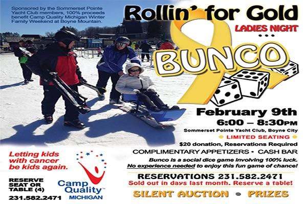 Cheers for Charity! Support Camp Quality Michigan children and families battling cancer when you attend "Rollin' For Gold" Bunco Ladies Night from 6 to 8:30 p.m. Tuesday, Feb. 9 at Porter Creek Fish House/ Sommerset Pointe. Admission is a $20 donation and reservations are required; this event sold out quickly last month. Call 231-582-2471 for reservations or register online. These events are available thanks to our generous and caring community donations, Sommerset Pointe members, and partnership with Challenge Mountain. Only $20 for food, friendship and fun. Bunco is a social dice game involving 100% luck. No experience is necessary to enjoy this fun game of chance. Space is limited.