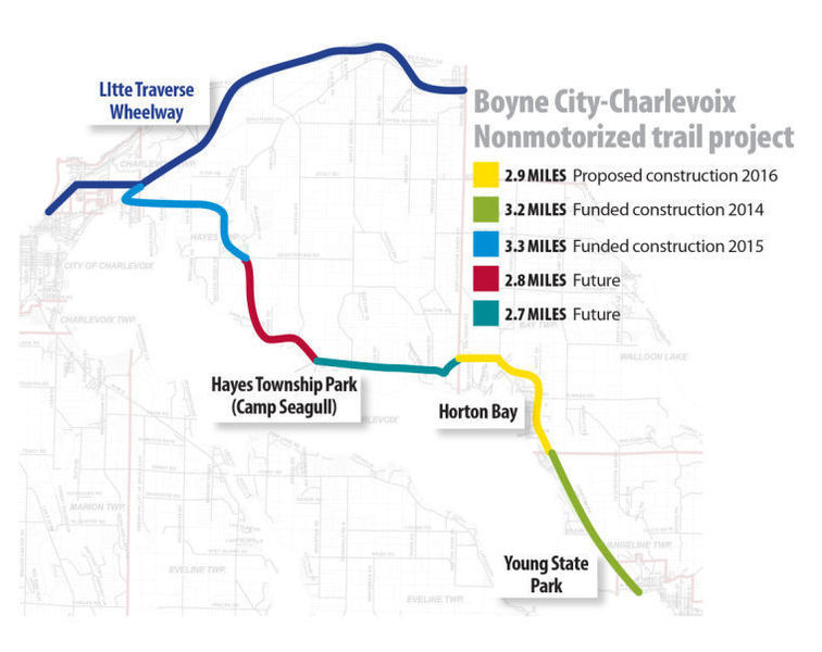 From the Petoskey News-Review: After multiple lengthy delays, construction on a recreational non-motorized trail between Boyne City and Charlevoix will begin next week. Boyne City city manager Michael Cain said the start date of the first phase of the project is Thursday, March 3 and is scheduled for completion by the end of July. The first phase of the trail is 3.2 miles from the Boyne City limits through Young State Park and about one mile beyond, ending at Sumner Road. The second of five phases to be constructed will run 3.3 miles, originating from the Little Traverse Wheelway in Charlevoix. The third phase will be from Sumner Road through Horton Bay and will be 2.9 miles long. Full story.