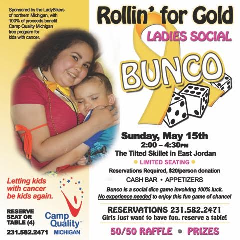 Support children with cancer. All proceeds go to Camp Quality Michigan summer camp. Bunco is a social dice game involving 100% luck. No experience is necessary. $20 for food, friendship and fun. Sunday, May 15th, 2-4:30 p.m. at the NEW Tilted Skillet in East Jordan (formerly Murray's). Call 231-582-2471 for reservations or register online. Space is limited.