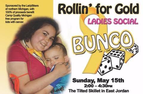 Support children with cancer. All proceeds go to Camp Quality Michigan summer camp. Bunco is a social dice game involving 100% luck. No experience is necessary. $20 for food, friendship and fun. Sunday, May 15th, 2-4:30 p.m. at the NEW Tilted Skillet in East Jordan (formerly Murray's). Call 231-582-2471 for reservations or register online. Space is limited.