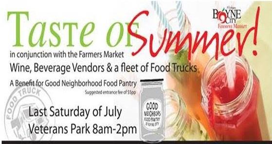 The Good Neighbors Food Pantry of Boyne City is having a "Taste of Summer" fundraiser the last Saturday in July. At the Farmer's Market that day, until 2 p.m., we will have an area cordoned off with Food Trucks, Wine and Beverage Vendors and a Cookie Sale. For a $5 suggested donation per person they can access the various vendors for some delicious food and drink. The Cookie Sale will have a terrific variety of homemade cookies made by Food Pantry volunteers available by the dozen and half dozen.