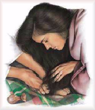 While Jesus was in the religious leader's home whose name was Simon, a woman from the city burst into the house. She had a reputation in the area as one who was "a sinner" as Simon referred to her in his mind. This woman had heard that the Teacher was there visiting with Simon and she sought Jesus out for she wanted to be forgiven of the lifestyle that she had been living. Her heart was utterly broken over the kind of sinful woman she had been. As she humbled herself and took on the posture of a servant to wash Jesus' feet, she bent down and wet His feet with her tears. She was overwhelmed with emotion and the tears gushed out and spilled onto His feet and then she wiped them with her hair, while kissing His feet and anointing them with precious ointment (perfume). All she wanted was to be forgiven and to show her love to the one person that could forgive her. It was an act of utter humility, knowing that Jesus was very different from the religious leaders she knew and that He would love her and accept her.