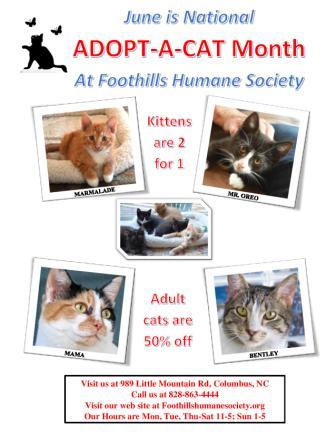 Event: Adopt - A - Cat Month Place: Foothills Humane Society 989 Little Mountain Road Columbus, NC 28722 Hours: Mon, Tues, Thurs - Sat 11-5, Sun 1 - 5 and closed Wednesdays Adoption fee for kittens are 2 for 1 and adults cats are 50% off through the month of June. |