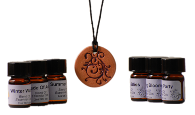 Our custom AromaSwirl Necklace comes with your choice of any 2ml AromaVeil blend, undiluted. (Shades of Autumn, Winter Warmth, Spring Party, Summer Days, Morning Bloom or Infinite Bliss). Just add a couple drops of the blend to the terra cotta necklace and you are ready to go.