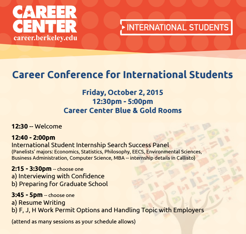 2) Go to Workshops within Events tab 3) Search for "Career Conference for International Students"