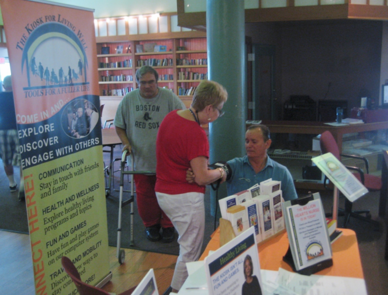 Brenda Raney, the Million Hearts nurse with The Kiosk for Living Well meets with a consumer at the Lynn Council on Aging.