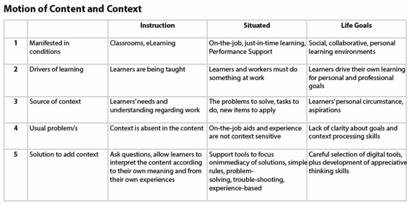 The content is the object while the context is the enabler. Ideas are not useful unless context is added to it. The challenge is not context per se, but the difficulty in adding context and catching the shifting meaning depending on the conditions. The needs of the learners and workers varies and changes. Please refer to other definitions of