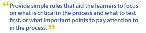 Situated conditions where the learner must perform something on the job, the learning aid must be organized in such a way that the immediacy of solutions are effectively applied or used. For example, when workers need a process check to help them solve a problem, don't just provide the process in the learning aids. Provide simple rules that aid the learners to focus on what is critical in the process and what to test first, or what important points to pay attention to in the process.