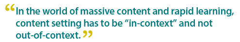 Content and context work hand in hand. Content is the object while context is the enabler to add value, usefulness and relevance. The challenge is that most content are presented without the context. And an even bigger problem is not realizing that context changes have taken place depending on the learning conditions. We need to be aware that different methods and skills are required if learners are to find context - meaning and relevance - of the content. In the world of massive content and rapid learning, context setting has to be "in-context" and not out-of-context."