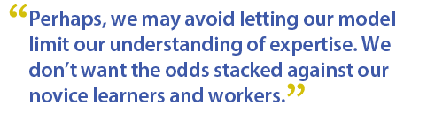 My sense is that our current of definitions and understanding of expertise may be at odds and stacked against helping novices to become experts. These are some ideas I have pondered on. I continue to plow the literature on expertise and find it most exhilarating and inspiring.
