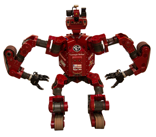 With one month to go before the DARPA Robotics Challenge finals, June 5- 6 in Pomona, Calif., CMU's Highly Intelligent Mobile Platform robot, or CHIMP, is in the final stages of training to compete against machines from 25 of the top robotics engineering centers around the world. Standing 5 feet, 2 inches tall and weighing 400 pounds, the Tartan Rescue team's CHIMP, developed at the National Robotics Engineering Center, is preparing to navigate the physical tasks it must complete better and faster than its competitors to win the $2 million top prize. In the finals, tethers will not be allowed to keep robots from falling, wireless communications between the robots and remote handlers will be reduced and a surprise task will be added just prior to the competition. Cheer on CHIMP via Twitter @TartanRescue using #CMUteamCHIMP. Find out more about CHIMP