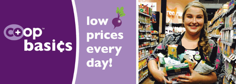 Looking to stretch your grocery budget? So are we! That's why we're pleased to introduce our new Co+op Basics program. Co+op Basics offers everyday low prices on a variety of popular grocery and household staples -- the building blocks for hearty meals and day-to-day living. From beans and broth to pasta and paper towels, you'll find new low prices on some old favorites, most of which are organic. Throughout the fall, we will be working hard to give you fantastic prices on even more of our best-selling pantry essentials so that you can spend your dough where it counts most for you and your family.