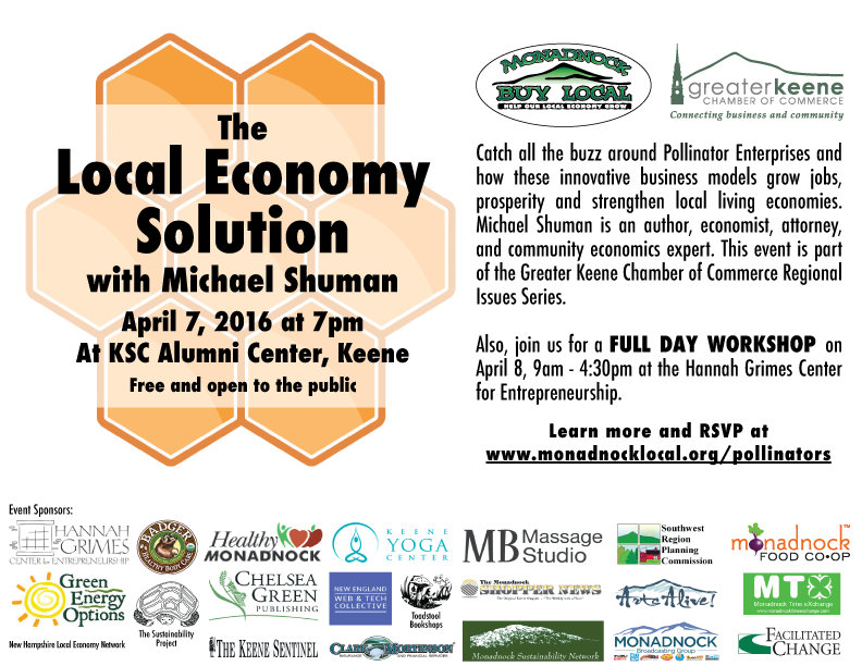 The Local Economy Solution: Pollinator Enterprises April 7, 7:00 - 8:30pm at the Keene State College Alumni Center, Keene Catch all the buzz around Pollinator Enterprises and how these innovative business models grow jobs, prosperity and strengthen local living economies. Keynote speaker Michael Shuman is an author, economist, attorney and community economics expert. This event is part of the Greater Keene Chamber of Commerce Regional Issues Series. Cost: Free. View event details.