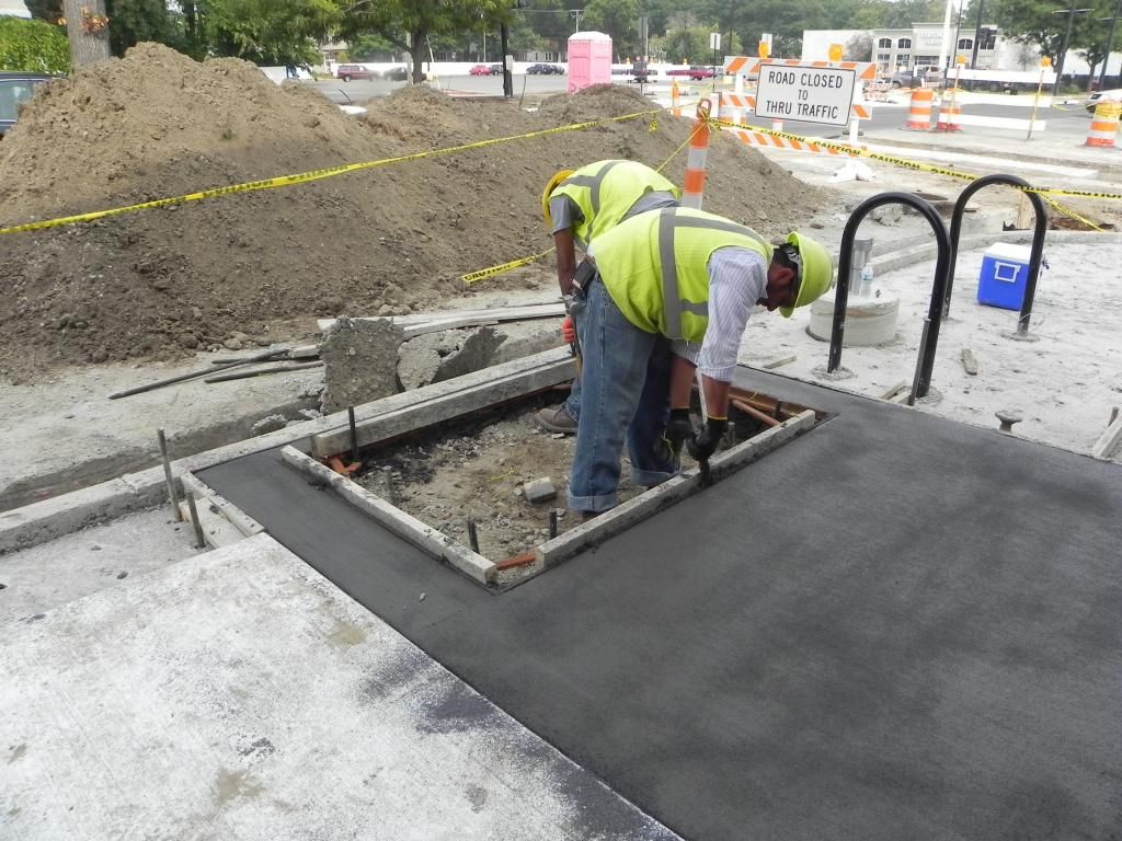 The streetscape is beginning to emerge! Piece by piece, bit by bit, the plan we envisioned so long ago is starting to show itself. While it is hard to believe that bike racks could be thrilling, we were thrilled to learn that\ two had been placed. And I hope you'll be as pleased as we were to learn that the sidewalks on the south side should be done by the end of next week!