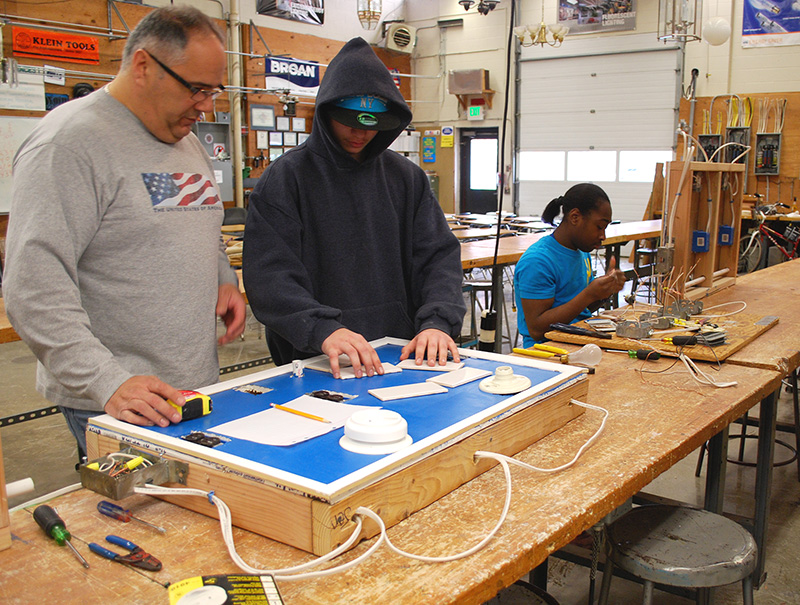Construction Electricity teacher Larry Marino works with Fox Meadow student Stephen Pisanelli of Peekskill, while Randall Davis of Mt. Vernon, another Fox Meadow student, works nearby.