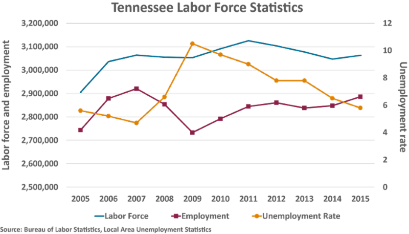 Tennessee's employment reached 2.9 million in 2015, approaching the 2007 pre-recession employment level and 153 thousand above the 2009 trough.