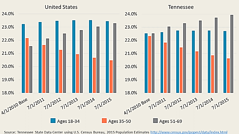 Baby boomers in 2015 (ages 51-69) made up the largest portion of the Tennessee population at 23.9%, as seen below. Millennials in 2015 (ages 18-34) followed closely behind at 22.7% and generation X (ages 35-50) at 20.6%. The nation, however, showed millennials with the highest share of the population at 23.4%. Baby boomers were just behind at 23.3% and generation X at 20.5%.