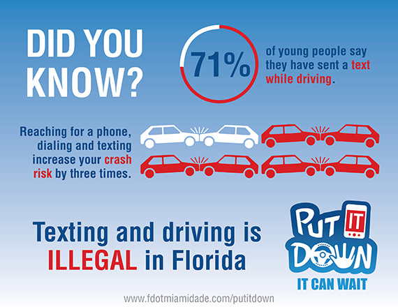 ¿Sabía que enviar un mensaje de texto al conducir es ilegal en la Florida? Si está manejando y decide tomar su teléfono, marcar y enviar un texto, esto puede triplicar sus chances de tener un accidente. Unase a la Ciudad de Coral Gables y al Departamento de Transporte de la Florida en la campaña "Put It Down" y suelte el celular. Esta campaña tiene el fin de educar a los conductores sobre los peligros de conducir distraídos. Lea más...