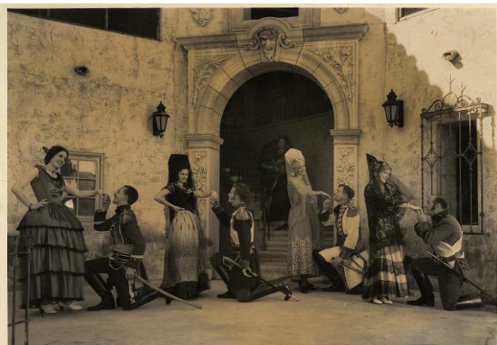 Una foto tomada en Coral Gables en la década de 1920, al frente de la Entrada Douglas, en donde las parejas visten trajes típicos españoles. Foto donada por Manley Brower.