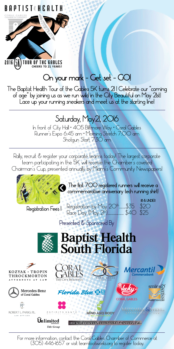 On your mark...get set...Go! The Baptist Health Tour of the Gables 5K run/walk will pace its way through the City Beautiful this Saturday morning, May 21, 2016. As we approach the starting line of this year's race, we invite you to celebrate the event's coming of age. That's right: the Baptist Health Tour of the Gables is turning 21 years old! This Saturday, May 21, runners will pound the pavement as the course takes you on a scenic route through our gorgeous Coral Gables. Enjoy the runner's expo beginning at 6:45 a.m. in Merrick Park across from City Hall, pre-race plyometrics next to City Hall, and warm up at 7:00 a.m. courtesy of the Coral Gables Athletic Club. The race begins at 7:30 a.m. with a shotgun start, led by a pace car courtesy of Mercedes-Benz of Coral Gables. Plus, the first 700 pre-registered runners are guaranteed to receive a commemorative running shirt in honor of this milestone anniversary. There is still time to put a team together to run or walk. The largest team participating will take home the coveted Chairman's Cup, presented annually by Miami's Community Newspapers. Read more...