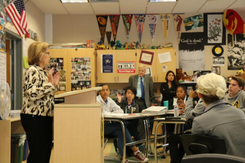 Students in Brian Cushing's AP US History class were babies when the 9/11 terrorist attacks on the World Trade Center occurred. But the students had the opportunity to gain a better understanding about that fateful day in American history from someone intimately connected to the World Trade Center, Cherrie Nanninga '66. The former Director of Real Estate for the Port Authority of New York and New Jersey, Nanninga's office was on the 88th floor of World Trade Center Tower 1.