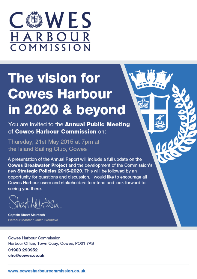 CHC Chairman Roger Mathias and the Commissioners will be present at the Annual Public Meeting on 21st May, and would like to extend an invitation to all Cowes Harbour users and stakeholders to attend. At the meeting, Harbour Master Capt. Stuart McIntosh will give a short presentation, on behalf of the Commissioners, on CHC's Annual Report for 2014-2015.