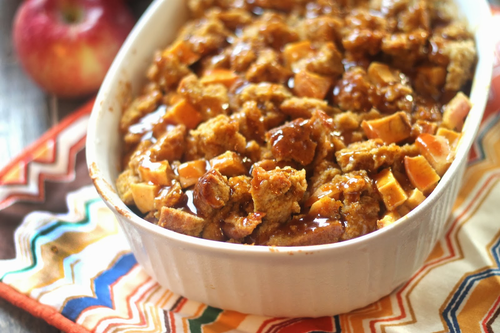 Whisk together pumpkin puree, eggs, milk, sugar, pumpkin pie spice, and vanilla extract until smooth and well combined. Toss with bread and apple chunks, and pour into baking dish.