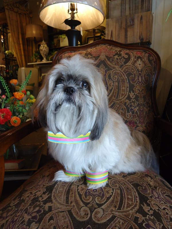 Never one to be outdone, she's sporting an alluring, striped contrasting collar and cuffs!