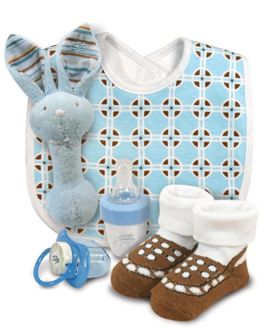 This gift set from Stephan Baby has all the perfect products to "induce" squeals of delight from the mom-to-be...oh, and the baby, too! Also available in a pink theme, the gift set comes in a ribbon-adorned, packaged ensemble that includes a plush rattle, cotton bib, mini medicine bottle, darling socks, and a (mandatory) pacifier, making it an ideal "grab-n-go gift"! Bella Says... "Now THIS is a ribbon-adorned ensemble! However, this package isn't for sale!!!"