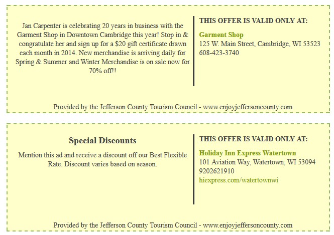 Have you checked out all of the great discounts offered in Jefferson County? From restaurants to B&Bs, from hotels to theater, to shopping shopping shopping - we have it all!