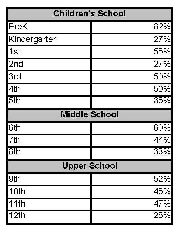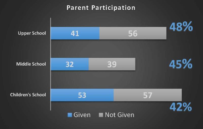Each division (Children's School, Middle School, Upper School) to reach 100% Parent Participation will receive a $500 grant for educational enhancements within the division. Under the direction of the Division Lead and with creative input by student leadership the $500 grant for 100% participation could be applied to a visiting artist, musical presentation, special assembly, off-campus experience, technology enhancement or equipment purchases to benefit the Division.