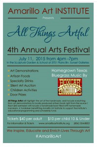 Saturday, July 11th from 4 - 7 PM Sunset Center's sculpture garden and Amarillo Art Institute. All Things Artful will highlight the art of the handmade, and include everything from various art demonstrations, to locally produced artisan foods right from the source! There will be samples to try, and live homegrown Texas Bluegrass music by the well-known Boxcar Bandits. Texas wines will be featured, with several wineries offering tastings. Specialty coffee, bottled wine, baked goods, as well as locally raised beef will be on sale for attendees to take away. In addition, guests will be able to indulge in homemade ice cream, and keep a unique handmade bowl filled with their choice of flavors for each full-price admission paid. Come and celebrate the arts in all their forms, from traditional painting and pottery to the art of producing delicious and healthful homegrown, and homemade delicacies, while at the same time supporting the Amarillo Art Institute. Attendees of the 9:30 AM service on June 28 and July 5 are eligible for a drawing of 2 tickets to the event. Tickets are $40.00 per guest and $10 per child 10 years old & under Click here or call (806)354-8802 for information & tickets