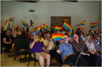 Our thanks to Texans for Marriage and Equality Texas for allowing AUUF to host the Decision Day celebration, to Panhandle Pride for letting us host the Film Festival, and to the many AUUF members and friends who brought delicious food and drink, made the popcorn, staffed the kitchen, worked behind the scenes in so many ways, and cleaned up afterwards. Also, a special thanks to Rev. Bernie Barbour for talking about his experiences in NYC during that time period.