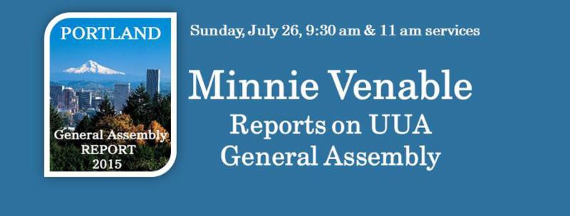 As one of our representatives to the Unitarian Universalist Association's General Assembly, Minnie Venable will report on the decisions voted by the assembly and other activities in Portland, Oregon, June 24-28. The theme of the GA in 2015 was Building a New Way.