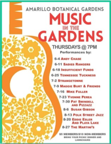 The final concert of this 2015 season is here! The Martini's perform Thursday, August 27, 7 PM at the Amarillo Botanical Gardens. Bring your lawn chair, picnic basket and drink of choice to enjoy the music and the gardens. $5 each for members (bring membership card) $10 each for non-members.