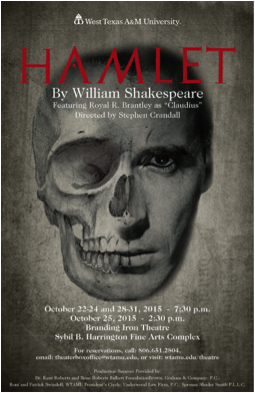 Royal R. Brantley plays the role of Claudius in this production directed by Stephen Crandall. Tickets for adults are $12 and for seniors or non-WT students are $8.All seats in the Branding Iron Theatre are reserved (no general admission). For reservations call 806-651-2804. You can also purchase tickets online.